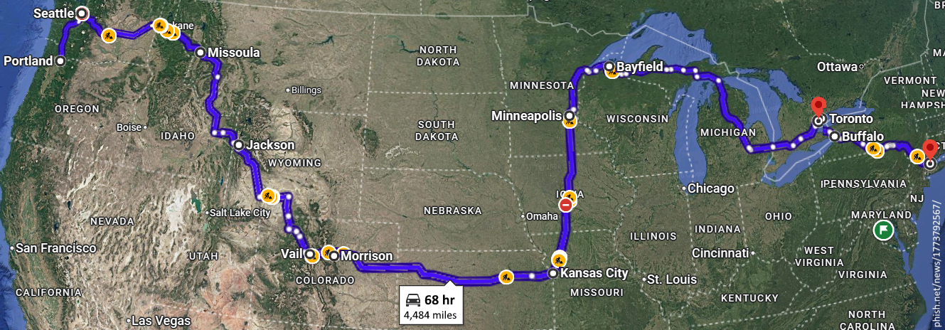 The tour will cover 4,484 miles, from Trey's third appearance at Arlene Schnitzer to his 18th at the Capitol Theatre, a journey that Google says could be done continuously in under 68 hours. We recommend that you instead take 33 days (from May 26 through June 26th) and plan two nights each in Missoula and Port Chester.